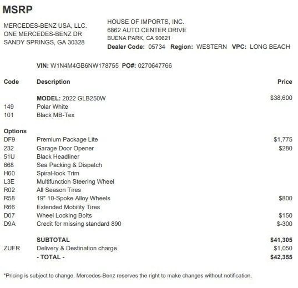 Accessories and color may vary. Quoted price subject to change without notice to correct errors or omissions. New vehicle pricing may already include applicable manufacturer special offers which may expire at any time. Manufacturer special offer data and vehicle features is provided by third parties and believed to be accurate as of the time of publication. Please contact the store by email or phone for details and availability of special offers. Sales tax or other taxes, tags, registration fees, government fees, smog certificate of compliance or noncompliance, emission testing charge, electronic filing fee, and $85 dealer document preparation charges are not included in quoted price.
