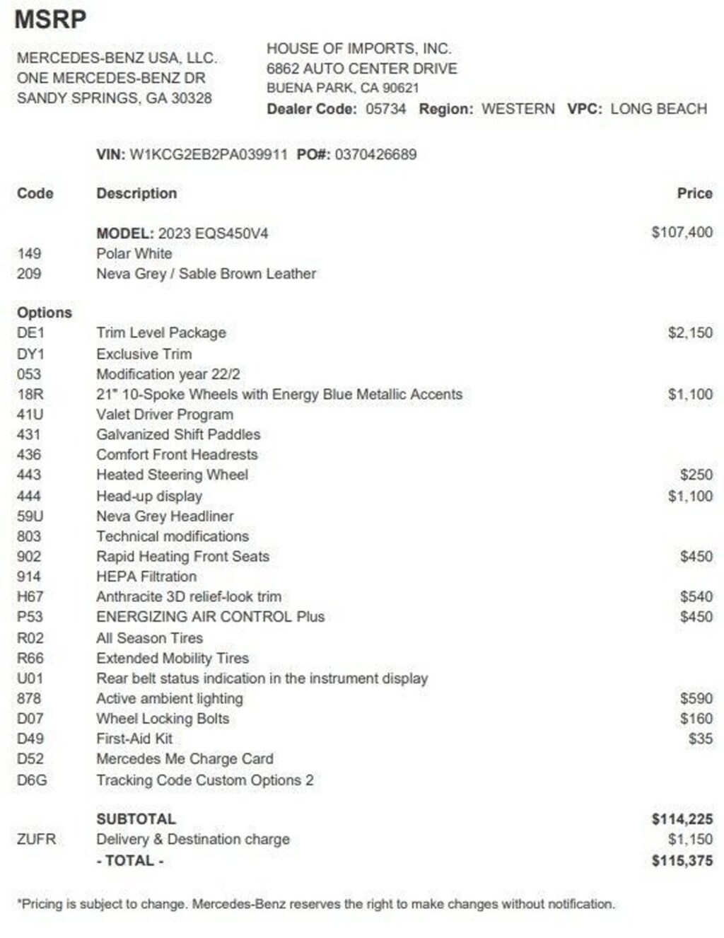 Accessories and color may vary. Quoted price subject to change without notice to correct errors or omissions. New vehicle pricing may already include applicable manufacturer special offers which may expire at any time. Manufacturer special offer data and vehicle features is provided by third parties and believed to be accurate as of the time of publication. Please contact the store by email or phone for details and availability of special offers. Sales tax or other taxes, tags, registration fees, government fees, smog certificate of compliance or noncompliance, emission testing charge, electronic filing fee, and $85 dealer document preparation charges are not included in quoted price.