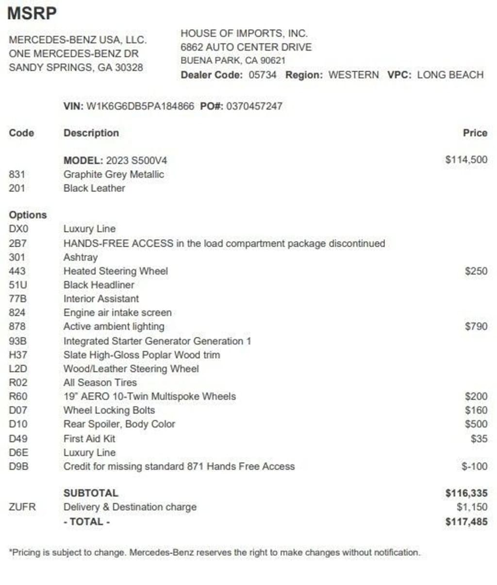 Enjoy the grip and control of AWD performance in this nicely equipped Mercedes-Benz S-Class S 500. There is no reason why you shouldn't buy this Mercedes-Benz S-Class S 500. It is incomparable for the price and quality. The look is unmistakably Mercedes-Benz, the smooth contours and cutting-edge technology of this Mercedes-Benz S-Class S 500 will definitely turn heads. The 2023 Mercedes-Benz exterior is finished in a breathtaking Graphite Grey, while being complemented by such a gorgeous Black interior. This color combination is stunning and absolutely beautiful!