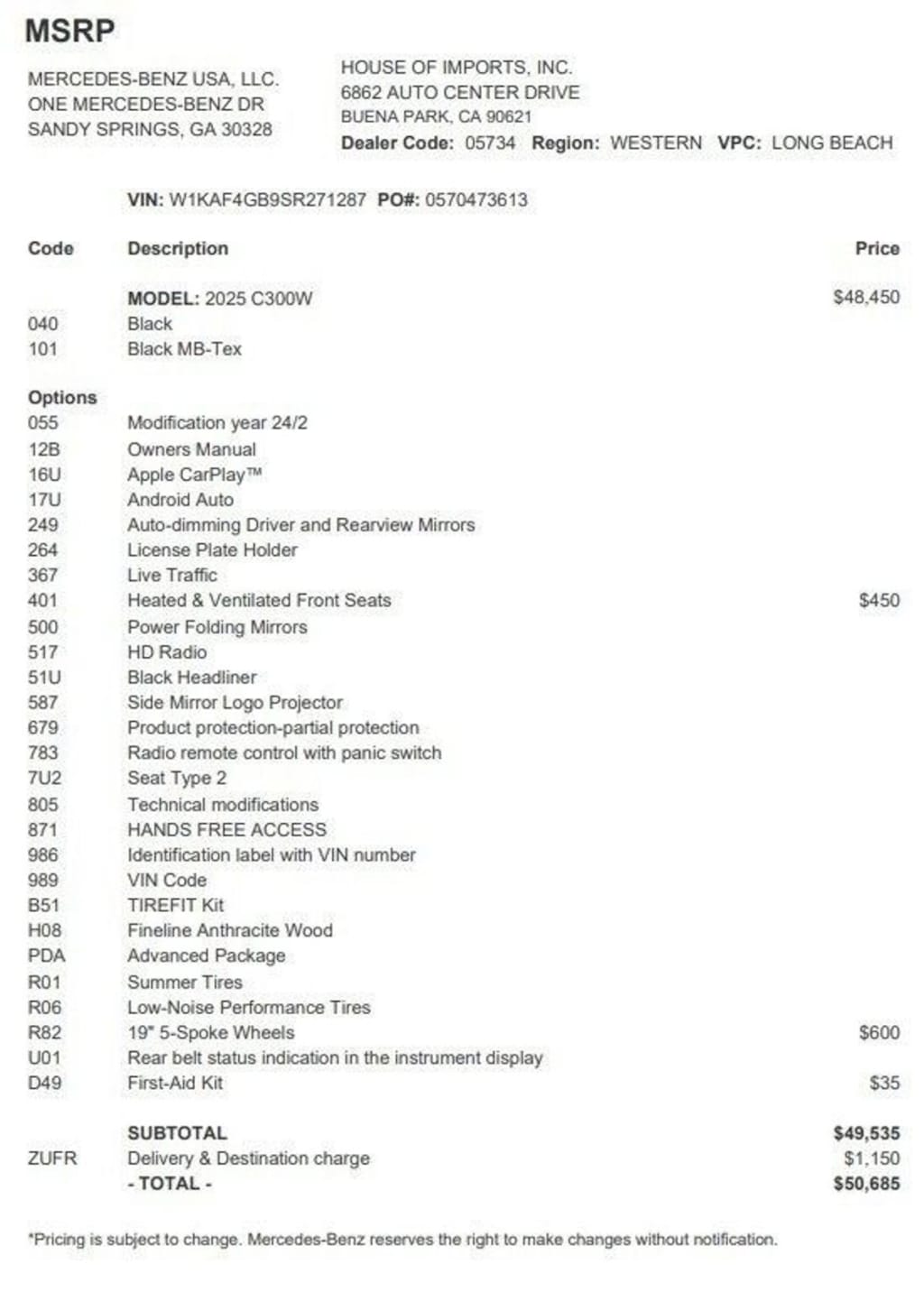 Accessories and color may vary. Quoted price subject to change without notice to correct errors or omissions. New vehicle pricing may already include applicable manufacturer special offers which may expire at any time. Manufacturer special offer data and vehicle features is provided by third parties and believed to be accurate as of the time of publication. Please contact the store by email or phone for details and availability of special offers. Sales tax or other taxes, tags, registration fees, government fees, smog certificate of compliance or noncompliance, emission testing charge, electronic filing fee, and $85 dealer document preparation charges are not included in quoted price.