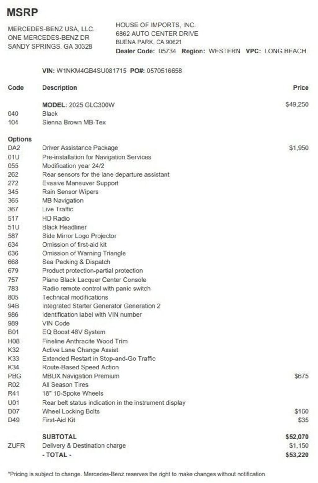 Accessories and color may vary. Quoted price subject to change without notice to correct errors or omissions. New vehicle pricing may already include applicable manufacturer special offers which may expire at any time. Manufacturer special offer data and vehicle features is provided by third parties and believed to be accurate as of the time of publication. Please contact the store by email or phone for details and availability of special offers. Sales tax or other taxes, tags, registration fees, government fees, smog certificate of compliance or noncompliance, emission testing charge, electronic filing fee, and $85 dealer document preparation charges are not included in quoted price.