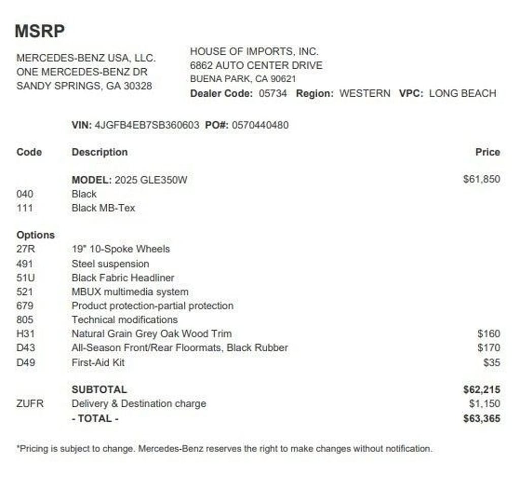 Accessories and color may vary. Quoted price subject to change without notice to correct errors or omissions. New vehicle pricing may already include applicable manufacturer special offers which may expire at any time. Manufacturer special offer data and vehicle features is provided by third parties and believed to be accurate as of the time of publication. Please contact the store by email or phone for details and availability of special offers. Sales tax or other taxes, tags, registration fees, government fees, smog certificate of compliance or noncompliance, emission testing charge, electronic filing fee, and $85 dealer document preparation charges are not included in quoted price.